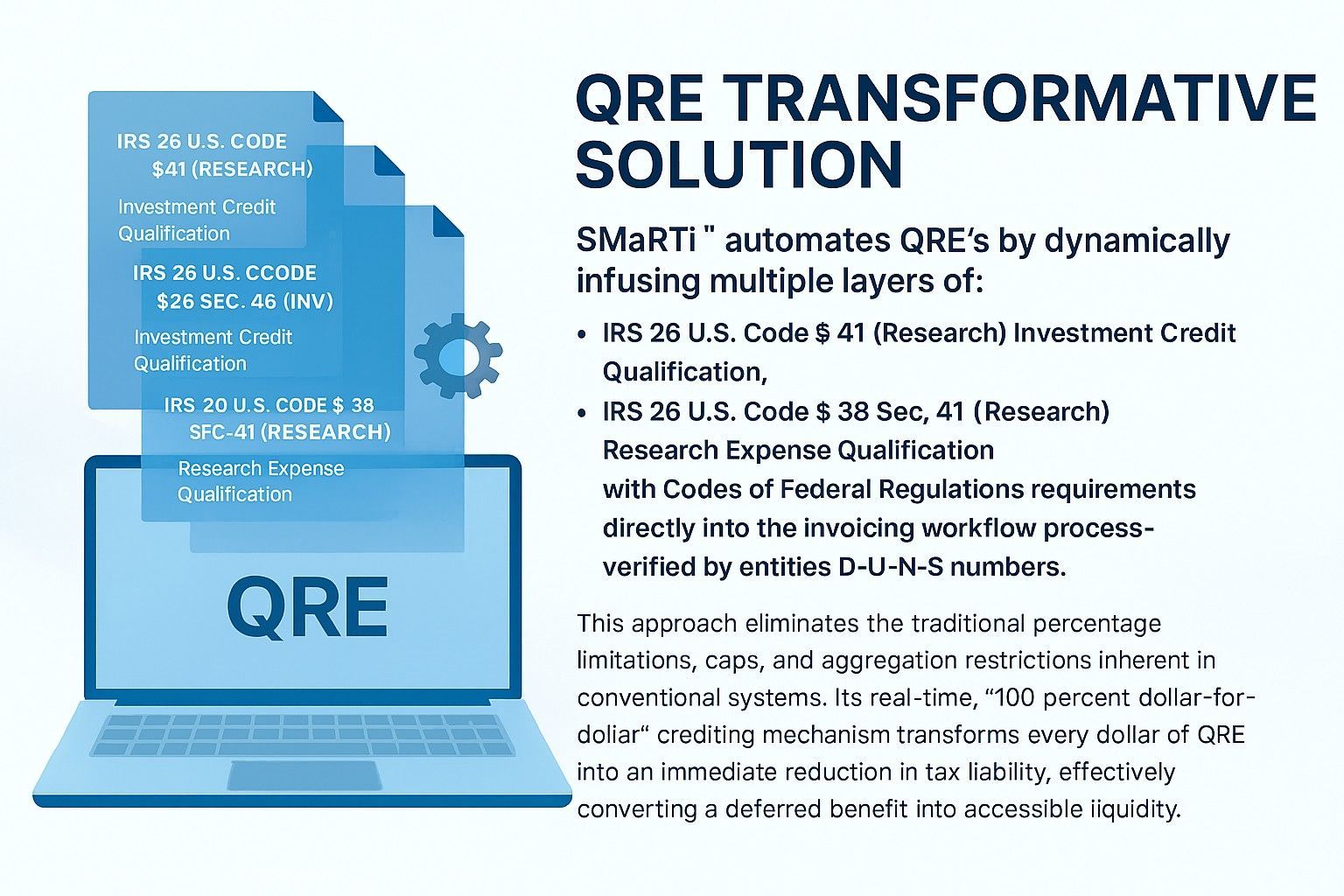 - تطبيق تنظيمي مباشر:من خلال تضمين تكرارات مختلفة من اي ار سي و سي إف آر في جوهر النظام، لا ينتظر SMaRTi™ عمليات التوفيق الدورية. يقوم بمعالجة وتطبيق القيمة الكاملة لكل QRE عند حدوثهايضمن هذا التكامل أنه حتى لو كان قانون مصلحة الضرائب الداخلية قد حدد تاريخيًا حدودًا أو ائتمانات تعتمد على النسبة المئوية، فإن النظام يستفيد من تطبيقه المباشر والمضمن لتقديم ائتمان كامل وفوري بقدر ما تسمح به اللوائح.